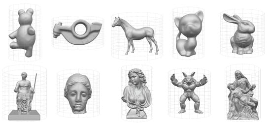 The lateral surface of the bounding cylinder is denoted as , where . This surface is the foundation for storing the weights for camera path determination. In this formulation, h represents the height of the cylinder, while r stands for its radius. The generated is uniformly divided by m in the u direction and n in the v direction, creating grids to allocate weights. Figure 2 displays the results of equal partitioning of bounding cylinders for ten triangular mesh models. To allocate the weight with the toroidal patches to the uniform grids of , we orthogonally project the centroid of each face (triangle) onto . This projection involves computing the direction vector D that originates from a point on the axis of and shares the same height as the face’s centroid, pointing towards (i.e., passes by the face’s centroid and a point on ). The centroid is then offset by r in the direction of , and the resulting projected vertex is mapped to its corresponding grid.