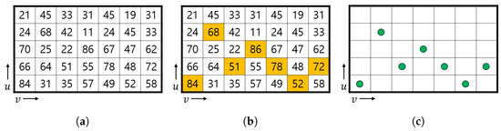 Example of control point selection process: (a) grids with their weights, (b) selected grids with maximum weight, and (c) selected control points for generating periodic B-spline curve.