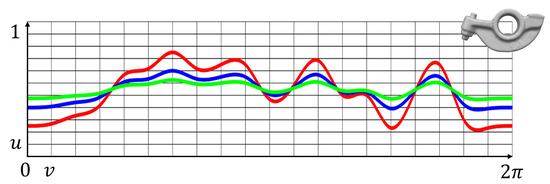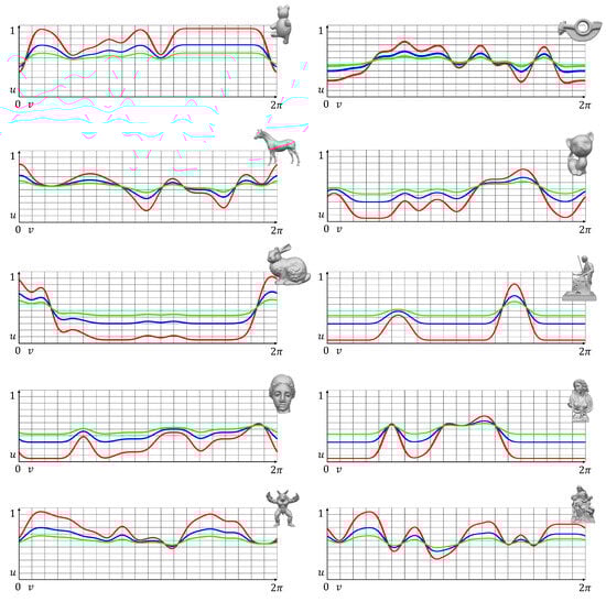 Figure 6 illustrates the camera’s starting position on the camera path for each input model. This starting point is determined based on the grid with the maximum weight, where the model’s curvature undergoes the most significant change. Figure 7 presents the generated camera gaze paths for the input models in 3D, depicted in blue. For clarity comparison, Figure 8 shows the generated camera gaze path (blue), the position path (green), and the initial third-order periodic B-spline curve (red) in the parameter domain of . These paths are closely aligned with areas exhibiting significant curvature changes. In instances like Figure 7a,c,d,g, points with significant curvature changes are concentrated in specific areas compared to other models, leading to a more detailed observation of these areas. As shown in Figure 7e,f,h, the model has a flat area where the evaluated curvature is nearly zero. When this flat area is notably extensive, the camera path is designed to focus on this flat area. The substantial curvature variation between the flat and non-flat area boundary resulted in more toroidal patches allocated to the boundary faces than other areas. However, although Figure 7j exhibits similar characteristics, its path behaves differently. This difference is due to the numerous points with significant changes in curvature, present not only at the bottom but also throughout other areas of the model. In Figure 7b,i, points with significant changes in curvature are distributed throughout the model, guiding the camera path to capture the entire model.