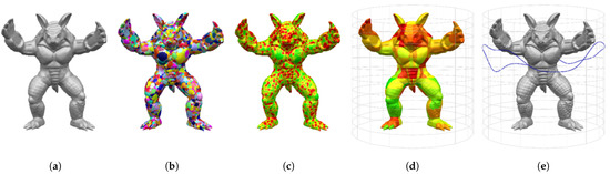 Figure 5 presents the results of applying the complete process to the triangular mesh model. Figure 5a shows the smoothing result [23], and Figure 5b shows faces with different colors according to their toroidal patches’ relationship. Figure 5c displays the mesh face weights, while Figure 5d illustrates mesh portions within each cylinder grid, with colors derived from the weights in Figure 5c. In both figures, faces closer to red indicate higher weights, while those closer to green indicate lower weights. Figure 5e displays the camera gaze path in blue, which is generated using our method.