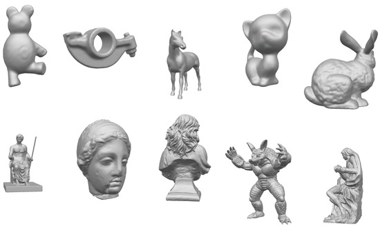 about various triangular mesh models. In sequence from left to right and then top to bottom: Bear, Rocker, Horse, Kitten, Bunny, Haris, Venus, Popiersie, Armadillo, and Pieta.