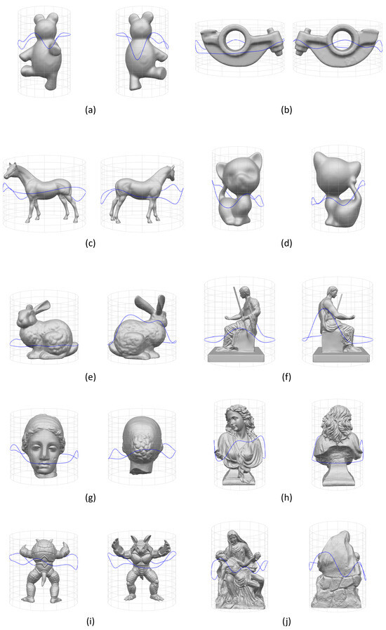 Ten selected triangular mesh models with bounding cylinder and camera gaze path: (a) Bear, (b) Rocker, (c) Horse, (d) Kitten, (e) Bunny, (f) Haris, (g) Venus, (h) Popiersie, (i) Armadillo, and (j) Pieta.