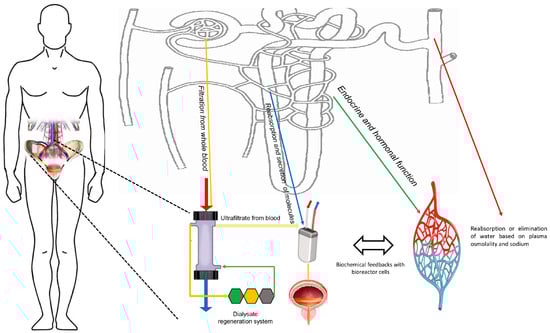 The most important aspect that should lead the development of the new generation of artificial organs is that natural kidneys are not mere organs of filtration. As a matter of fact, they are also in charge of several metabolic functions, such as the synthesis of 1,25-dihydroxyvitamin D (1,25(OH)2 D) [4], ammonia genesis [5,6], glutathione metabolism [7], erythropoietin production [8], and immunoregulatory support [9]. Thus, to truly fulfill every kidney function, the renal metabolic role is to be taken into consideration. In fact, modern designs of artificial kidneys put much emphasis on the efficiency of dialysis and fluid removal but not on its metabolic functions. From a clinical point of view, this lack of metabolic activity requires the use of specific drugs that must be administered to the patient according to a biochemical feedback that has to be regularly checked with blood tests. Therapeutic adjustments are therefore subject to a constant delay due to the inability to have continuous online feedback as is the case with the metabolic activities of the natural kidney. Typical examples are changes in the dose and frequency of erythropietin administration to maintain a constant hemoglobin in the patient, or the administration of vitamin D analogs to maintain proper bone metabolism. At present, the most effective approach to replacing organ function is the utilization of transplanted organs. Despite the limited organ availability and possible post-transplant complications, kidney transplantation remains the optimal treatment for ESKD. On the other hand, dialysis—both extracorporeal and peritoneal—is only life-sustaining and provides limited removal of uremic toxins. Despite the advances in technology, hemodialysis (HD) is still expensive, burdened by higher mortality, vascular access complications, and lesser quality of life and patient satisfaction compared with peritoneal dialysis, which, however, presents lower efficacy and a high risk of infections, which are the primary reason for transfer to HD [10]. Home hemodialysis (HHD) is believed to be more physiological and better tolerated by patients than in-center hemodialysis. Moreover, it has a number of advantages, including improved survival and quality of life (QOL), flexibility, and potential for employment compared to in-center hemodialysis [11,12,13,14]. Technological research has moved towards the improvement and miniaturization of home hemodialysis services in order to overcome the constraints of standard HD with the development of new purification devices, such as novel dialyzers that mimic active processes of ultrafiltration and secretion in the native kidneys [15], membranes, wearable technology and sorbents for regenerating dialysate. These advances represent the first step towards the development of implanted devices capable of fully replacing natural renal function.