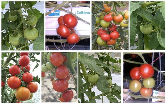 In this study, a unique database containing 2260 tomato images was developed. Of these, 700 images were taken in greenhouses in Niigata (Niigata Prefecture, Japan). The remaining 1560 images were carefully selected from various publicly available sources, including Kaggle and Github [29,30,31], to ensure the greatest representativeness and diversity. During the selection, special attention was paid to aspects such as tomato ripeness, lighting conditions, shooting angles, and background features, as demonstrated in Figure 1. As a result, the database covers images of tomatoes grown under a variety of conditions, including greenhouse conditions. This approach to database compilation was deliberately chosen to increase the reliability and universality of the analysis results.