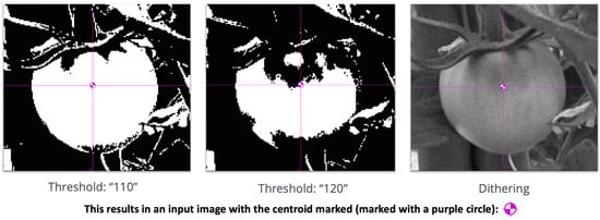 - Thresholding at an intensity of 110: This technique involves setting a threshold at an intensity value of 110. Pixels with an intensity that exceeds this value are labeled as the object (in this case, a tomato), whereas those with an intensity below this value are designated as the background. This approach is particularly advantageous for discerning the primary contours of the object in scenarios in which specific lighting conditions prevail.