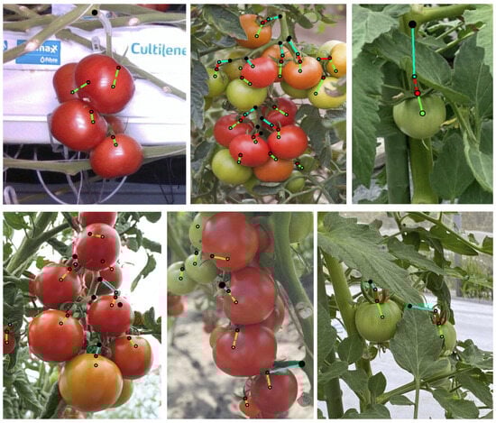 Figure 6 shows six tomato-brush images that demonstrate various stages of tomato ripening and arrangement, not including indistinguishable tomato key points. In each image, the tomato plants are marked using colored dots and connected by lines to highlight key anatomical points and their relationships. The lines that connect these points are represented in their respective colors, which indicate the anatomical relationships between these elements.
