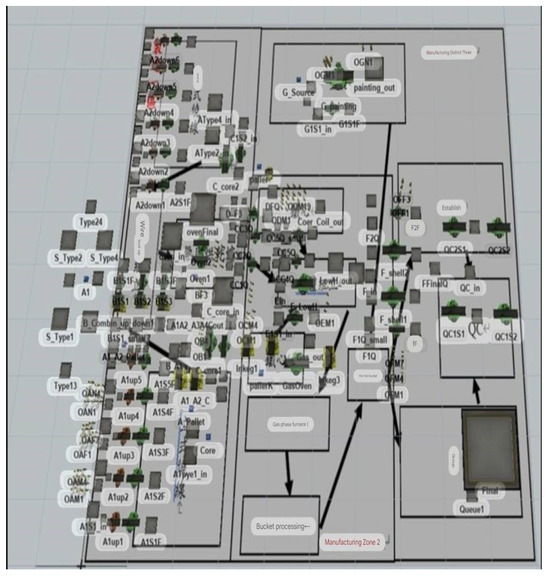 System simulation can not only perform production simulation for production lines but can also be used in companies that need to build new factories. The FlexSim simulation model was used to conduct a detailed analysis of the original layout of the factory [13,14]. A large amount of data was collected through these simulation experiments, and a comprehensive study was conducted to analyze the bottlenecks and efficiency issues in the factory production process in depth. Using the analyzed data, researchers proposed improvement strategies and used them to optimize the factory’s production layout and techniques to improve production efficiency and quality.