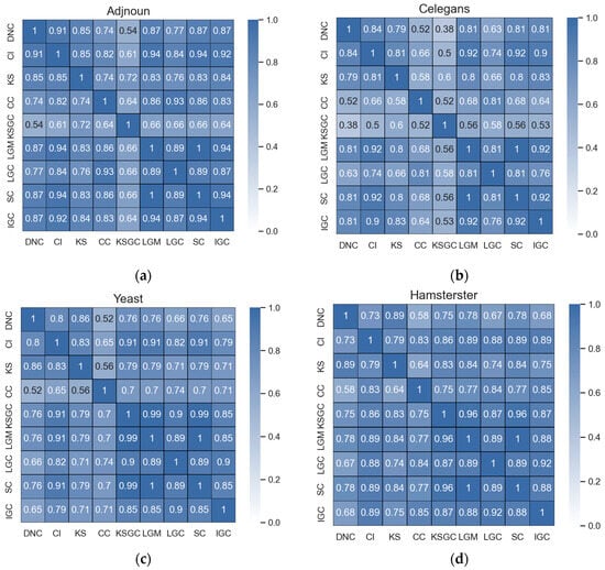 From the table above, we can observe that the top three nodes ranked by DNC are identical to those of LGM and LGC. There are slight variations in the ordering of the top five nodes between DNC, CI, LGM, and LGC. In the following sections, we will use Kendall’s Tau () to quantify the associations between the sequences generated by different methods.