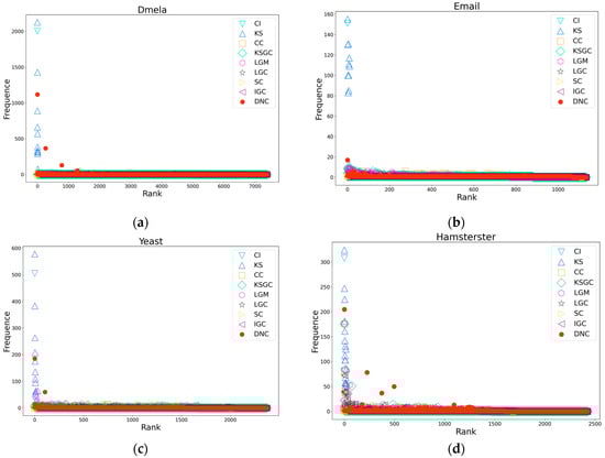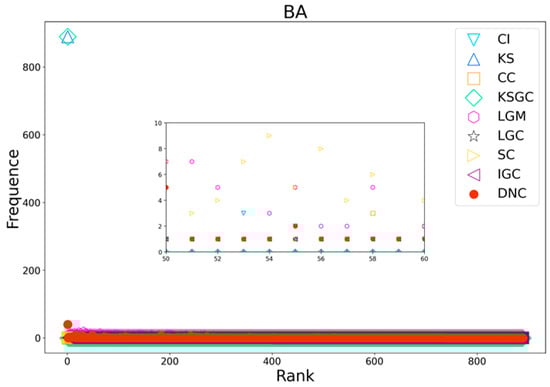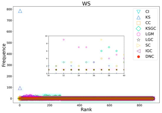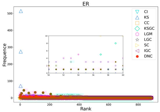 Figure 9 presents the rank distribution of the DNC method and baseline methods in the BA network. Figure 10 displays the rank distribution of the DNC method and baseline methods in the ER graph. Figure 11 illustrates the rank distribution plot on the WS network. From these three rank distribution graphs, it is evident that the DNC method is capable of drawing a nearly flat line at the bottom.