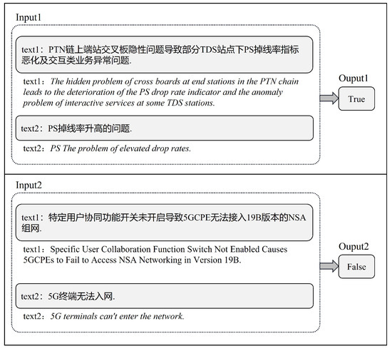 There are eight event types including “Index Fault”, “Soft Hardware fault”, “Collect Data”, “Check”, “Setting Fault”, “External Fault”, “Set Machine”, and “Operate Machine”. The event-specific trigger terms and event elements are diverse, such as “Configuration”, “Mismatch”, and “Inconsistent” in the “Set Machine” event. Meanwhile, the event descriptions are presented in the form of text pairs, accompanied by labels denoting “True” or “False” to indicate whether they are coreferent. Thus, the CCKS 2021 dataset can concurrently evaluate the tasks of event extraction and event coreferential resolution, and we can use the results of event extraction to supplement the auxiliary features in the task of event coreferential resolution. The CCKS 2021 dataset is open access and contains a total of 15,000 sample data which were randomly divided into training, validation, and test sets with a ratio of 6:2:2.