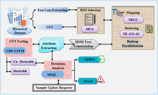 The Graphical User Interface (GUI) is the most promising factor in the Software Development Lifecycle (SDL), which allows the users to interact with the system. To ensure user-friendliness, GUI Testing (GT) is required. The traditional testing techniques attained flawed results due to having inappropriate functions. Hence, Global Decaying Probabilistic Long Short-Term Memory (GDP-LSTM) and Standard Deviation Q-Learning (SDQL)-based automatic testing for GUI are proposed as solutions. Initially, the Test Case (TC) and GUI are extracted from the historical data and are subjected to Region of Interest (ROI) analysis. Here, an appropriate ROI is analyzed by Module Coupling Slice (MCS), and it is fed into Hadoop Parallelization (HP). Now, Spectral Kernelized Gaussian Clustering (SKGC) and Non-Linear Elite Guided Optimized Ant Colony (NE-GO-AC) are used to perform mapping and reducing, respectively. Likewise, the parallelized output is utilized to construct the Document Object Model (DOM) tree. Then, the attributes are extracted and given to the GDP-LSTM classifier that effectively predicts whether GUIs are desirable or undesirable. Then, the undesirable results are inputted into a SDQL-based deviation analysis. If the deviation is low, it is assumed as an update; otherwise, it is considered as an error. The experimental analysis depicted that the proposed system attained high dominance with 98.89% accuracy in the prevailing models.