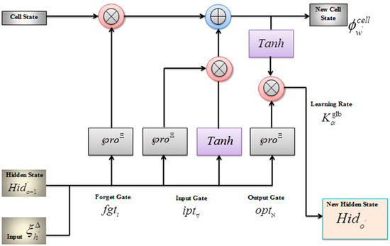 where represents the present cell state, denotes the vector function of the cell state, depicts the element-wise multiplication, specifies the tangent function, represents the removed information, and indicates the allowed information.