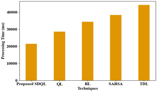 Based on MSE and MAPE, the performance validation of the proposed work and existing techniques is shown in Figure 3. The proposed SDQL obtained an MSE and MAPE of 1.018% and 0.305%, respectively. Furthermore, the traditional models acquired an average MSE and MAPE of 6.173% and 0.675%, respectively. The proposed system is proved as a less error-prone model. Next, the proposed SDQL’s Processing Time (PT) is analyzed with the existing works in Figure 4.
