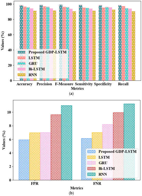 Performance assessment with respect to (a) accuracy, precision, F-measure, sensitivity, specificity, and recall; (b) False Positive Rate (FPR) and False Negative Rate (FNR).