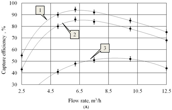 In addition, analysis of the relationships presented in Figure 8B showed that there is a nonlinearity in agglomeration efficiency versus flow rate. In the case of using a stepped radiator, nonlinearity is associated with an increase in the probability of collision of large particles held at the nodes of a standing wave with newly arrived particles.