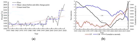 Variation tendencies and catastrophic analysis of the monthly average discharged change of the Min River in the dry. (a) Runoff situation at different periods. (b) The MK test and cumulative anomaly values.