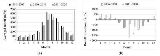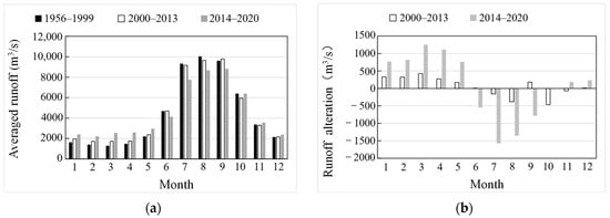 Monthly average runoff and alteration during different periods of the Min River. (a) Monthly average runoff at different periods. (b) Monthly average runoff variation values.