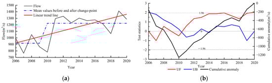 The dry discharge variation trend of the Min River was also further analyzed by the Theil-Sen median trend method combined with the Mann-Kendall test. Through the trend test analysis of monthly average discharge of Min River in January and March. during 2006–2020, the Theil-Sen median value was calculated as 28.3, with a normalized test statistic Z of 4.48, exceeding the 95% confidence level of 1.96, which indicted that the monthly average discharge increased significantly in the dry, as seen in Figure 4a. And the M-K mutation shows that UF has always been positive since 2010, namely that dry discharge has still increased. The curves of UF and UB intersected in 2010, which was located in the confidence zone. Therefore, the mutation time was preliminarily determined to be 2010.