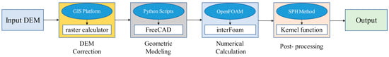 As a result of advancements in remote sensing technology and computer capabilities, GIS has emerged as a predominant platform for simulating landslides and debris flows [34,37]. Within the GIS framework, expression formats primarily comprise vector data and grid data formats. Among these, the grid data format proves optimal for representing fields and aligns well with the Eulerian description approach. Particularly for flow-like models on GIS platforms, the grid networks of DEM facilitate streamlined and accurate calculations [38]. Therefore, we have devised a solution to construct a three-dimensional landslide dynamic model based on DEM. At the same time, we borrowed from the SPH kernel function to transform the simulation results into two dimensions, allowing for their visualization within a GIS platform. The comprehensive process is methodically segmented into five distinct phases, as shown in Figure 1: (1) DEM correction, (2) geometric modeling, (3) numerical calculation, and (4) post-processing.