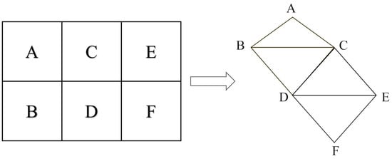 We exemplify the method for acquiring fundamental information on triangular patches using a grid data configuration featuring three rows and two columns. Given the pixel values associated with raster cells A, B, C, D, E, and F, our approach involves traversing each row of the raster data. Upon encountering raster cell A, we initiate the retrieval of pixel values for its three neighboring cells—specifically, B, C, and D. Following this, we meticulously assess the validity of pixel values for cells B and C. Once both the B and C data are validated and provided that the pixel value of A is also verified, the raster cells A, B, and C coalesce to form the triangular facet ABC. Analogously, if the pixel value of D satisfies the validity criteria, raster cells B, C, and D collectively compose the triangular facet BCD. This sequence of operations is replicated as we proceed to traverse raster cell C, during which we employ the identical methodology to scrutinize the pixel values of cells C, D, E, and F. Assuming that the data for all the aforementioned cells are substantiated as valid, a total of four triangular facets can be synthesized (Figure 2). More precisely, a set of four adjacent raster cells constitutes the basis for generating two distinct triangular facets. Within the context of an m-row and n-column dataset, the theoretical potential exists to derive up to (m − 1) × (n − 1) × 2 triangular facets. It is of paramount importance to underscore that the term “valid pixel values” within the aforementioned context pertains to pixel values that are devoid of anomalies and conform to predetermined stipulations encompassing both the raster and data ranges.