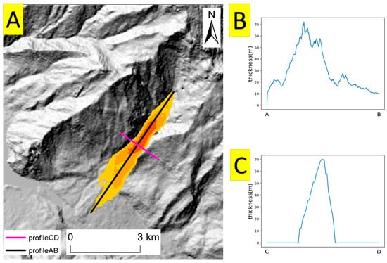 Changes in Yigong landslide deposit thickness: (A) schematic diagram of profile AB and profile CD; (B) changes in accumulation thickness along profile AB; (C) changes in accumulation thickness along profile CD.