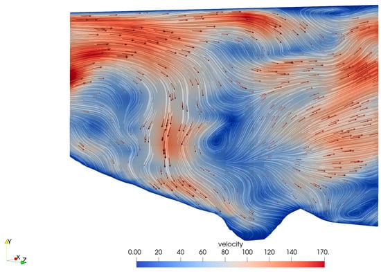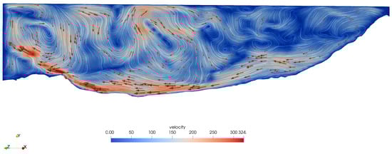 In the direction perpendicular to the channel, specifically along the CD profile, the fluid moves from the left side of the channel to the right side, i.e., from a relatively higher altitude to a lower one. In the central part of the channel, where the landslide deposits have the maximum thickness, the air exhibits turbulent flow, while laminar flow predominates in the remaining areas. The movement of the landslide is primarily characterized by laminar flow, with the velocity decreasing closer to the bottom (Figure 8).