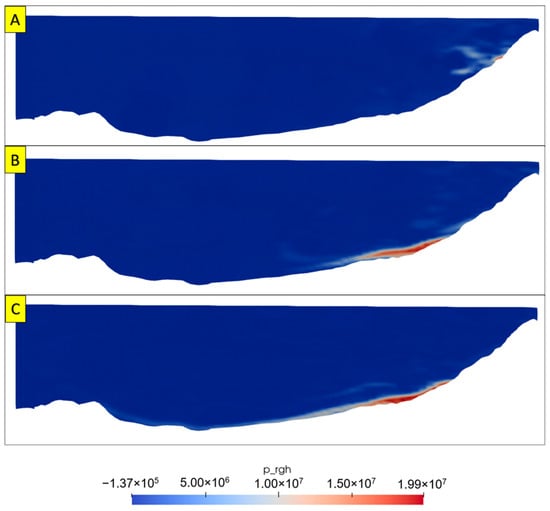 Pressure at Profile CD: (A) pressure distribution of profile AB at 20 s; (B) pressure distribution of profile AB at 40 s; (C) pressure distribution of profile AB at 60 s.