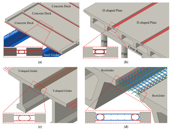 For the small- and medium-span assembled bridges with multi-girders, the girders in the same span need to be connected by certain longitudinal joints [23]. In the precast T-beam bridge structure, the application of longitudinal joints with a loop connection is more typical, as presented in Figure 1c.