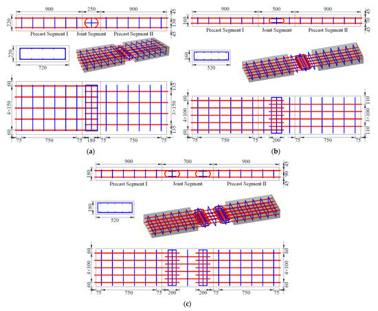 According to the common application situation as mentioned above, a series of specimens have been designed, as presented in Figure 2. The specimens can be divided into two categories according to the different arrangement of loop bars in the joint: (a) specimens with a single overlap and (b) specimens with double overlaps. The grade of concrete in the precast segments and joint segment is C50. The HRB400 steel bars are adopted. Except for the longitudinal loop bars, the diameter of the other steel bars is 16 mm.