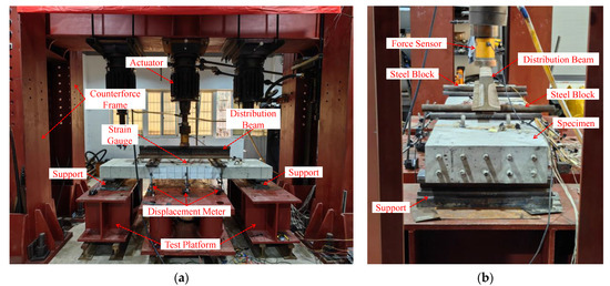 In the flexural fatigue test, the four-point flexural loading method is applied. The distance from each support to the end of the specimen is 150 mm. And the loading points are arranged at a distance of 550 mm from the support. The vertical load is transmitted to the steel blocks at the position of the loading points through the distribution beam, and a pure flexural segment is formed in the middle of the specimen. The arrangement of the test device is shown in Figure 3.