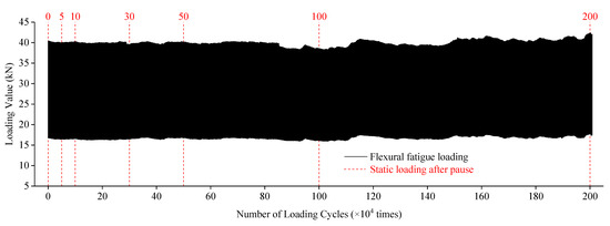 After 0 × 104 (i.e., before the fatigue loading), 5 × 104, 10 × 104, 30 × 104, 50 × 104, 100 × 104, and 200 × 104 fatigue-loading cycles, the fatigue test should be suspended, and the specimens will be subjected to static loading. During the static loading process, the specimens are loaded to the upper limit of fatigue by stages, and various parameters of the specimens are observed. Actual loading path for flexural fatigue test is demonstrated as Figure 4.