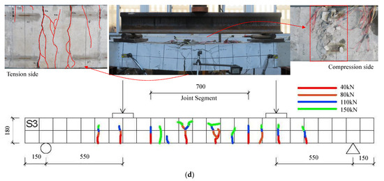 By comparing the three fatigue specimens, it can be seen that the smaller the width of joint is, the less the concrete crack appears in the joint. During the fatigue-loading process, the concrete first cracks at the interface of joint segment and precast segment, and the position on both sides of the center line with a distance of 50 mm. With the increase of the static load level, the height of cracks at these positions increases continuously. However, it no longer propagates when the cracks reach a certain height. The cracks begin to develop along the longitudinal direction of the specimen, and the crack morphology is presented as Y-shaped or T-shaped. In addition, it can also be learnt from the specimens SF2 and SF3 that the joint with loop connections usually crack at the overlapping positions. It is similar to the test results of the related flexural specimens [26,27,28].