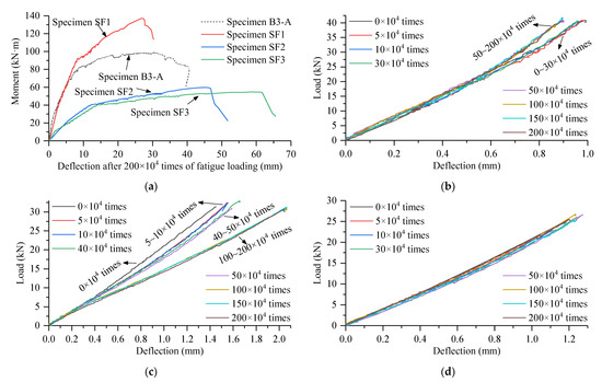 According to the proposed loading process, each specimen was subjected to static loading after a certain number of fatigue cycles. The load–deflection curves of each specimen during static loading are shown in Figure 7b–d. The following results can be analyzed from the experimental data: