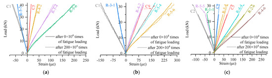 The strain results of the fatigue specimens SF1 to SF3 under static loading after 0 × 104 and 200 × 104 fatigue-loading cycles are compared in Figure 8. It can be learnt from the results that, except for the measuring point C9 of the specimen SF2, the difference between the results of each strain measuring point after 0 × 104 and 200 × 104 fatigue cycles is small. It can be considered that there is no obvious degradation of concrete and steel bars at the location of these measuring points.