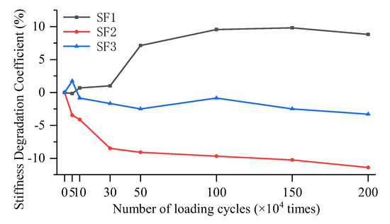 While for the specimen SF1, the stiffness degradation coefficient curve increases sightly after different durations of fatigue-loading cycles, there is still a downward trend. It can be considered that the fatigue-loading cycles even have some beneficial effect on the transverse joint of concrete–steel-composite bridge deck and pile–plate soilless subgrade structures. However, stiffness degradation caused by fatigue damage will still occur after long-term fatigue load.