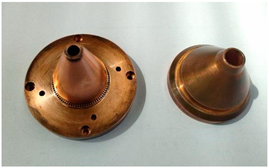 In the case of the specimens manufactured with hybrid technology, the additive manufacturing process consisted of a DED process using X2CrNiMo17-13-2 metal powder. The equipment used for the hybrid manufacturing process was a DMG Lasertec 65 DED hybrid machine with a COAX 14-coaxial nozzle technology installed at Compa S.A. Sibiu, Romania. The nozzle assembly is depicted in Figure 3.