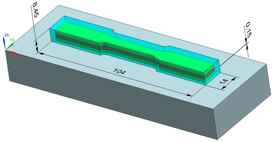 Considering that the laser deposition process creates a rough, uneven surface with low geometrical precision [17], to obtain the right dimensions for the specimens, the 3D DED specimen was fabricated with a 2 mm offset on all the part’s faces surfaces, which was removed using CNC manufacturing to obtain a precise geometry in conformity with the ASTM standard [16,18]. Moreover, to study the influence of the height of the DED process on the mechanical properties of the final part, the specimens were fabricated one on top of the other in stacks of 3, as detailed in Figure 4. Considering that we have 3 specimens with an offset of 0.15 mm between them and the base and an addition of 2 mm on top, the total height of the stack is 8.45 mm.
