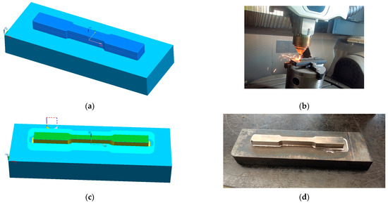 Specimen fabrication: (a) 3D model of the specimen stack; (b) specimen fabrication using DED; (c) specimen finishing process simulation using CNC milling; (d) specimen stack after finishing.