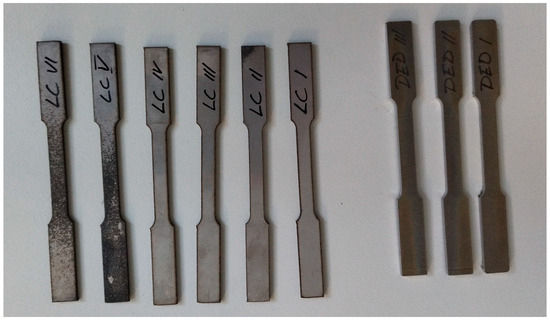 The materials used to manufacture the four sets of specimens were equivalent in terms of composition. In the case of the first specimen set, representing parts made by subtractive processes, the specimens were made of laminated sheet, while for the sets of specimens fabricated with hybrid manufacturing technology (DED and CNC milling), the material was X2CrNiMo17-13-2 as metal powder from Sandvik Osprey® powders.