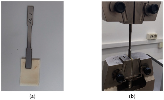 The specimens were subjected to tension tests until failure according to the ASTM E8/E8M standard [15] using a Galdabini Quasar 25 material testing machine to determine their mechanical properties. A 3D-printed mould was used to ensure a consistent placement of the specimens in the machine’s grips, as shown in Figure 8, and to position the axis of the test specimen coincidently with the centre line of the heads of the testing machine in order to minimise bending stresses which could affect the results. The 3D-printed mould did not affect the experimental results as it is thinner and weaker than the specimens and made of plastic material. The crosshead speed used for the tests was set to 0.5 mm/min.