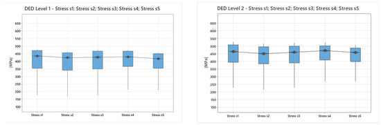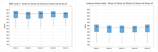 The tensile tests conducted on specimens produced by subtractive processes (laser-cut stainless steel) and hybrid manufacturing (DED process) revealed notable differences in mechanical properties, as can be seen in the boxplot for each specimen from Figure 9.
