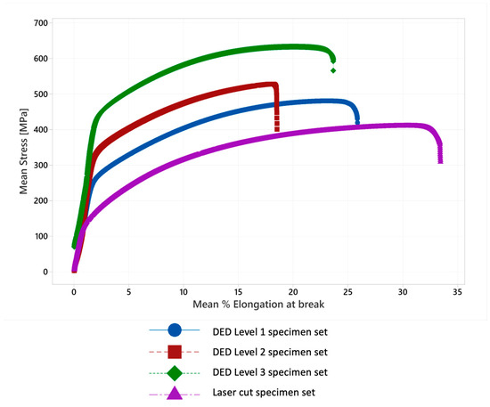 The scatter plot (Figure 10) showcases a comparative view of stress in [MPa] against the percentage of elongation for each specimen group’s mean value. Elongation (%) or reduction in area (%) represents the tensile ductility. The equation of determining elongation (%) was calculated by the testing machine using Equation (1), where L0 is the initial length of the sample and ΔL is the difference between the initial length and the elongated final length.