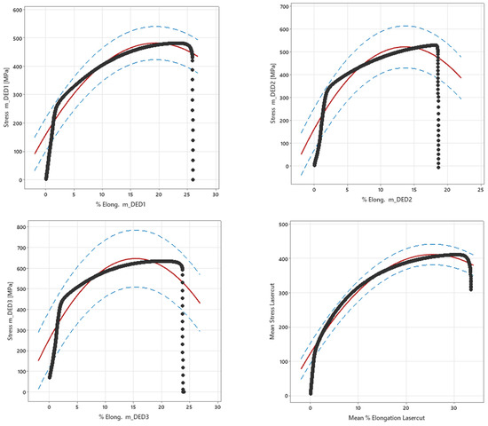 Using Minitab 20 software, a regression analysis (Figure 11) conducted for each specimen group’s stress and % elongation scatter plot enabled the creation of prediction plots, offering an empirical representation of the material behaviours under tension. The prediction plots contain the stress–strain curve for the mean of each specimen group, visually presenting the relationship between stress and % elongation.