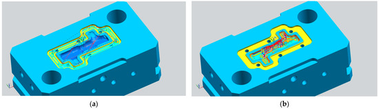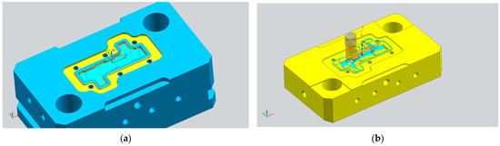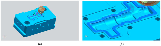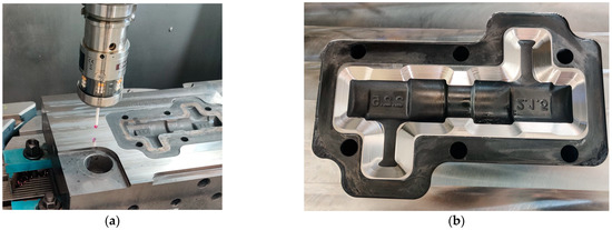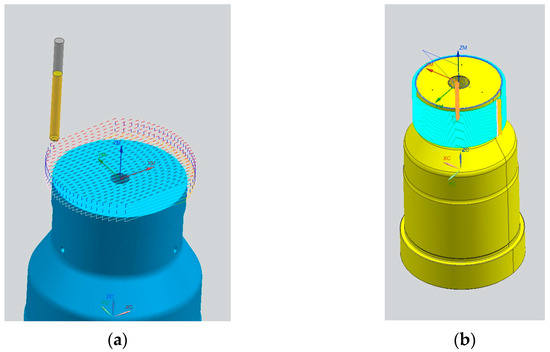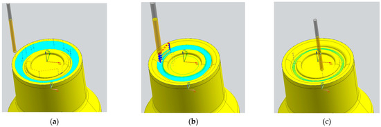 The initial step involved securing the forging tool onto the machine table, followed by precise measurements using the “Renishaw” 3D probe to determine its position and axis (Figure 25a). The CNC program work offset was aligned with the bottom of the forging tool.