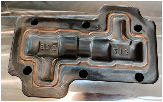 During the next stage, a front milling operation was conducted to establish the deposition base. The depth of this milling may vary based on the extent of wear and damage observed on the active profile of the forging tool. After the creation of the deposition base, a measurement and verification process ensured precision in the DED process. The succeeding laser deposition process was executed, and once the material was cooled to ambient temperature, mechanical operations involving roughing, semi-finishing, and finishing were applied. These operations are mandatory in achieving the desired final profile of the repaired forging tool (Figure 25b).