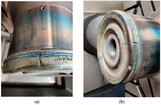 The problems that emerged during the repair process included cracks developed after cooling. They are due to non-observed deposition parameters or the sudden cooling of the deposited material. Incompatibility of the additive material can lead to poor adhesion, resulting in deposition errors or even collisions during the process. Notably, excessive initial power settings could deform the base material, visible through a bluish tint in the base material (Figure 29).