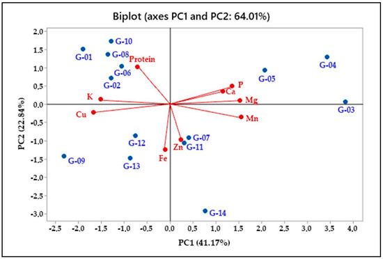 Principal component analysis (PCA) is an important tool for determining the significance of various traits and genotypes based on their contribution to the overall variation. Mineral elements such as Ca, Mg, Mn and P could be considered = the most informative for evaluating genetic diversity for the grain and protein content among the pigeonpea landraces due to their strong association with the first principal component (PC1). In this regard, the landraces such as ‘G-03’, ‘G-04’ and ‘G-05’ which were strongly associated with Ca, P, Mg and Mn could be considered for introgressing genes that control the accumulation of these nutrient elements. Similar studies involving PCA showed that pigeonpea and lentil were characterized by high calcium and protein contents, respectively [35,42]. The six landraces (‘G-03’, ‘G-04’, ‘G-10’, ‘G-01’, ‘G-09’ and ‘G-14’) which were positioned far from the origin of the biplot indicated that they were the most distinct and probably possessed unique genes associated with the grain traits.