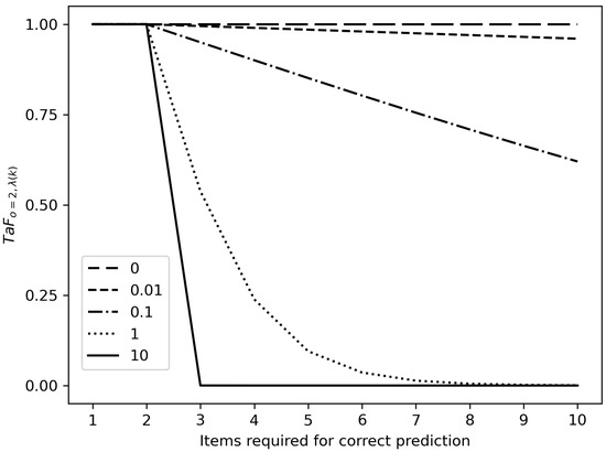 configured with point of measure and various values of . The number o items used to reach a correct prediction by the system are represented on the X-axis, supposing a delay was produced fro previous items. In this case, when the system outputs the proper prediction on item and, therefore, it generates a delay earlier on (i.e., ).
