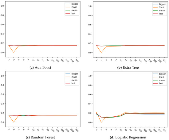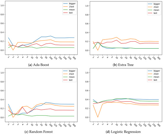 Results for eRisk dataset over Random Forest, Extra Tree, Ada Boost and Logistic Regression models are presented on Figure 3 and Figure 4. Figure 3 shows the results obtained with Time aware F-score metric, when compared with Figure 4, which shows the results when metric is used, some differences must be noticed.