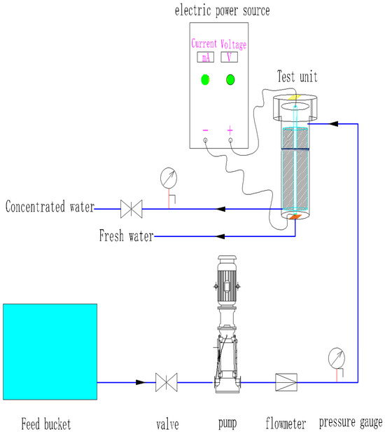 The experimental setup for this study comprised several components, including a raw water tank, booster pump, MFRO unit, pressure gauge, DC power supply, inlet, and outlet pipes. The test water was pumped into the MFRO unit using a booster pump, with the concentrated water and desalinated water flowing out of the concentrated water and fresh water pipes, respectively. The inlet flow rate was regulated by the flow meter and inlet valve, while the pressure was carefully controlled through the back pressure system. Figure 2 displays the schematic diagram of the process flow employed in this study.